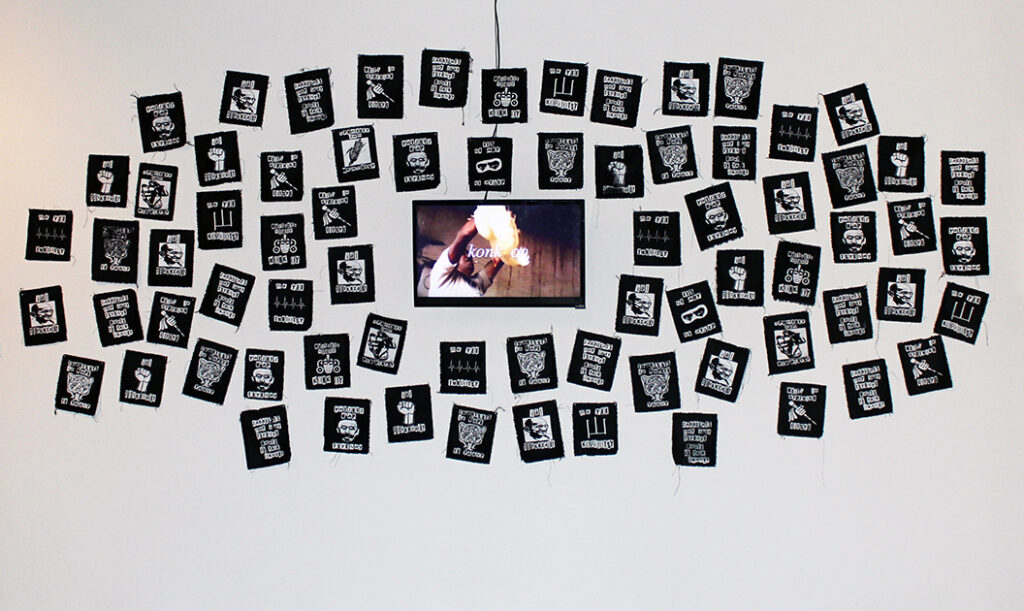 This video is accompanied by a series of silkscreened patches that replicate the iconography from urban punk clothing, which contain written fragments in Mixe of the aforementioned song; complemented by a series of high-contrast images from different references.