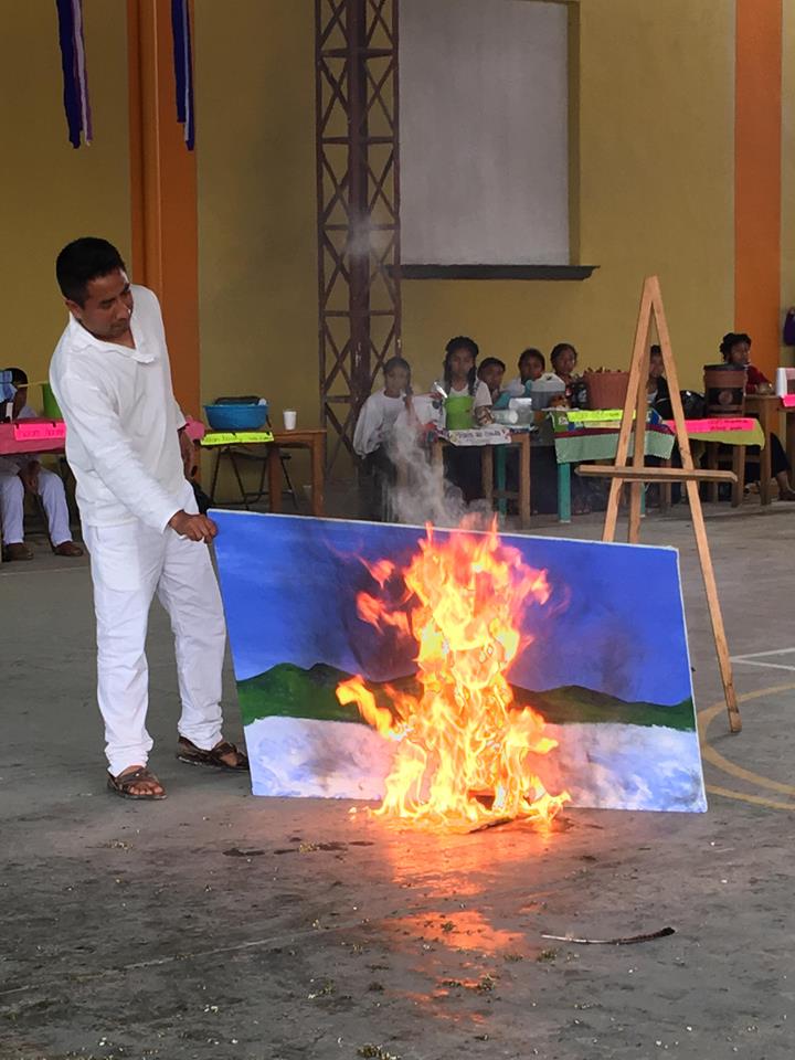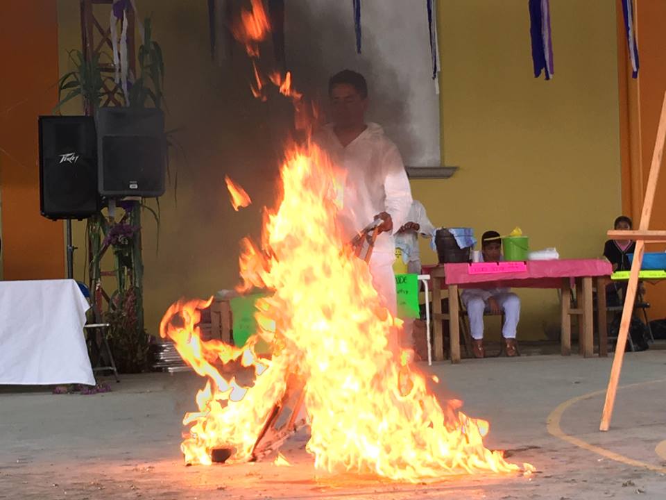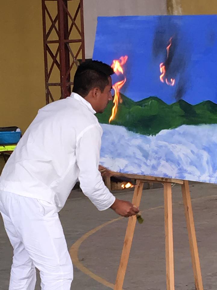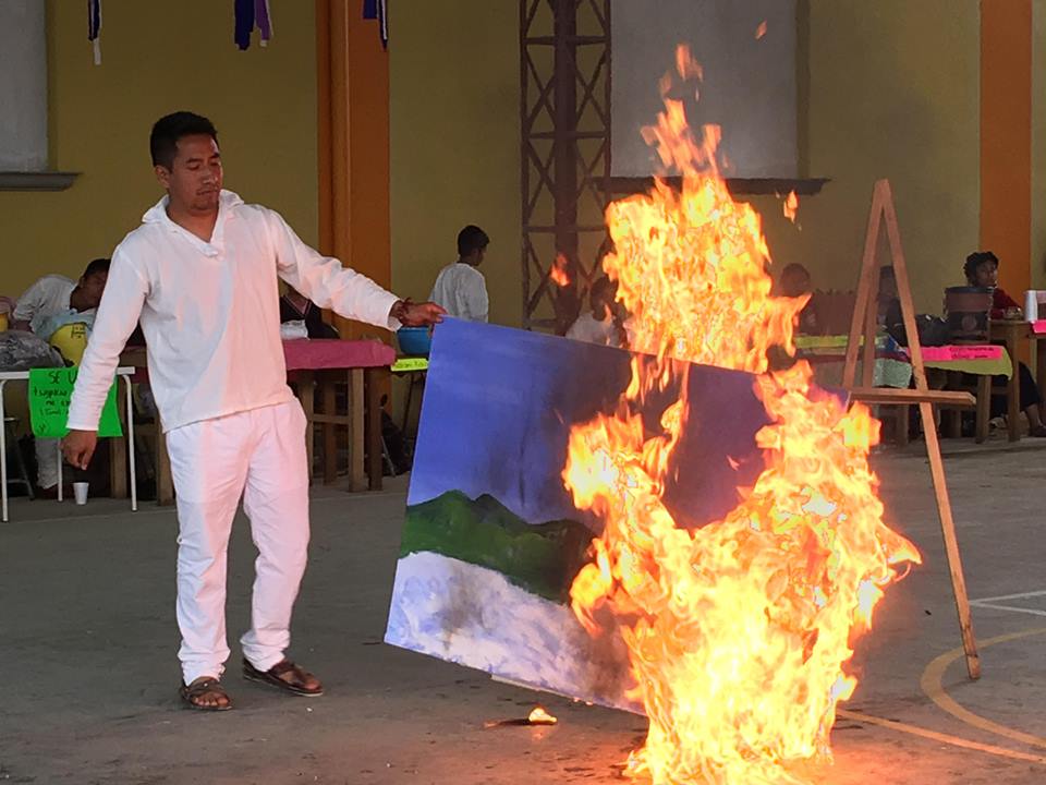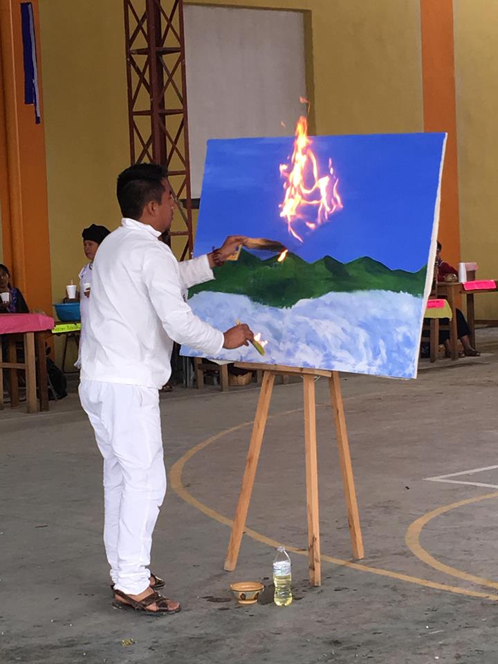 It was decided to make a piece that seeks to reactivate the historical memory of said community through an action-performance piece carried out in its daily space (municipal court). An action consisting of the burning of a painting representing I´px Yujkm, accompanied by a philharmonic band playing the waltz “God never dies” characteristic of wakes and funerals in this territory. Conceived as an ephemeral monument